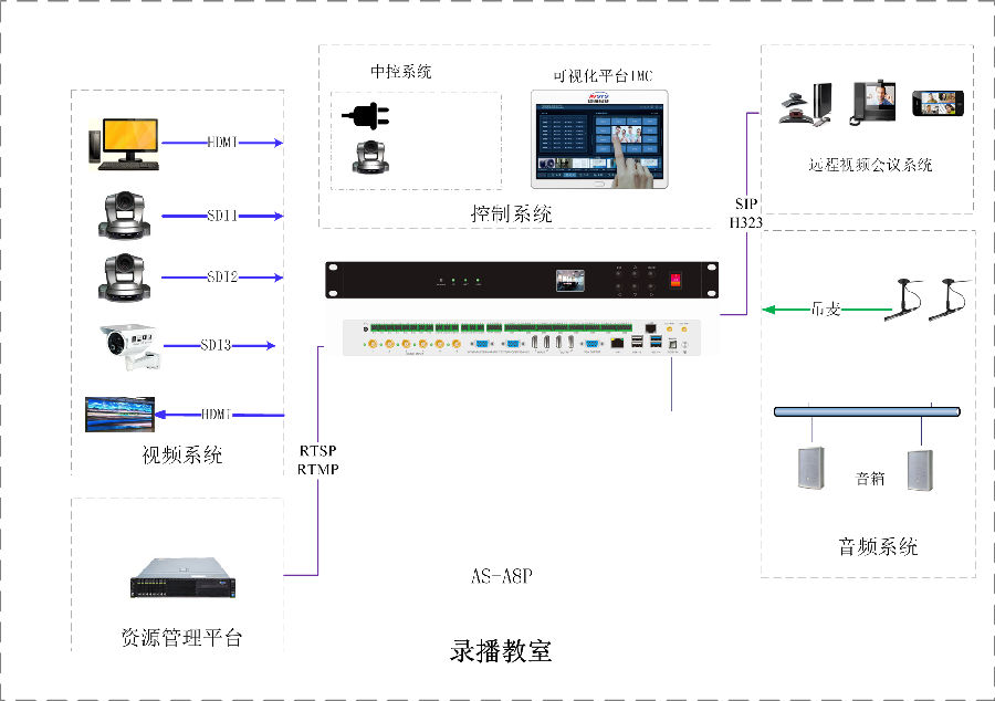 项目包含:本项目共建设1个录播教室,使用1台xpj.com-XPJ(中国区)科技(AVSYS)多媒体综合管理一体机,实现统一控制管理,音视频调度,会议室互动等应用。